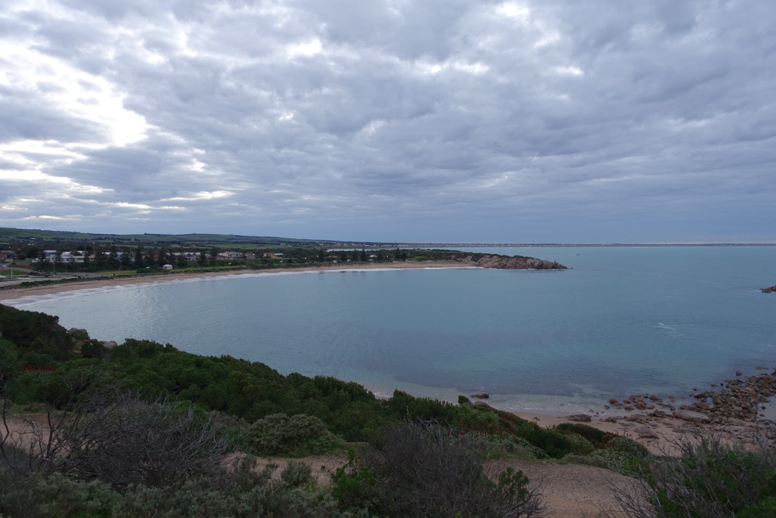 The ferry ride back to the mainland was fairly smooth in comparison to the other direction, but of course the lumpy road towards Adelaide was ahead of us. Although you don't actually get off to push your bike up the hill up, it does get to the slow speed with a loaded bicycle that you think you may as well. We travelled through lots of rural properties, most with sheep that will either run to the other side of the paddock on your approach or will just stand there staring at you as you stare at ewe. Lots of cute lambs that were huddling together out of the cold wind could be seen; I wanted to join in. As we rode into Myponga, there is a crazy Scottish scene of green hills that roll off into cavernous drops with sheep standing on tiny bits of the highest ground on the precipice of steep crevices. You roll around the corner of one of these and the waterfront opens up before you. All of a sudden its a change of pace: the road is flat rather than incessant climb, the wind that's been in your ears for days is now filled with out of the blue quiet, except the sound of rolling waves. You smell seaweed and salt on the air.